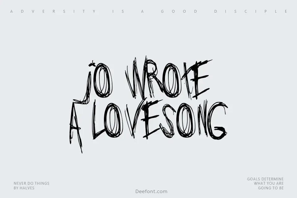 Jo wrote a lovesong is an expressive script font featuring distinctive pen stroke effects and handwritten characteristics. With its edgy, graffiti-like aesthetic, this display typeface brings casual energy and creative flair to posters, logos, invitations, and graphic designs. The multi-linear, scribbled appearance makes it ideal for projects seeking an authentic, street art feel. Its 653 glyphs provide extensive character support for diverse typographic applications. Perfect for apparel designs, wall art, and themed decorative typography.