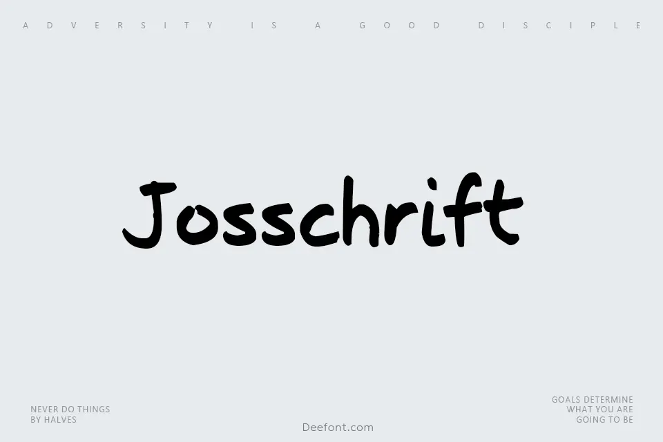 Josschrift Bold is a vibrant handwritten script font that brings authentic personality to your designs. With its characteristic rounded, slightly irregular letterforms and bold weight, this typeface delivers a warm, informal atmosphere perfect for greeting cards, journals, posters, and casual titling. The font’s personal handwriting style and playful character make it ideal for invitations, creative projects, and any design requiring a friendly, accessible touch. Its spontaneous energy shines through in personal stationery, children’s illustrations, and decorative applications where authentic charm matters most.