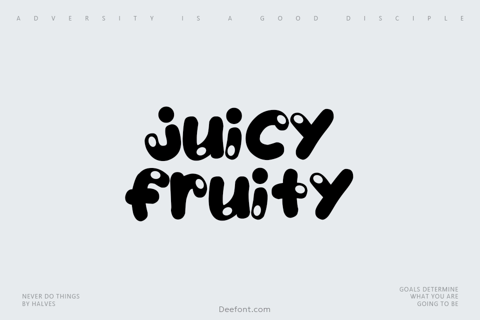 Juicy Fruity is a playful and bold display font featuring rounded, bubbly characters with a vibrant retro aesthetic. Designed with thick, substantial strokes and consistent character spacing, this decorative typeface exudes fun and whimsy, making it perfect for eye-catching headlines, playful branding, children’s books, party invitations, and creative projects that demand personality and visual impact.