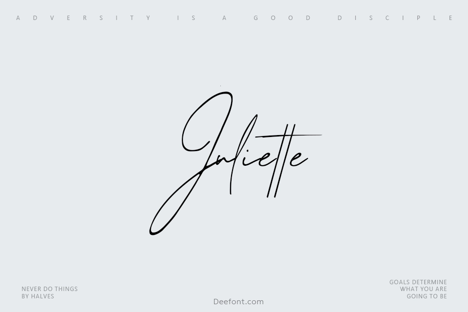 Juliette is an elegant handwritten script font that brings sophistication and artistic flair to your creative projects. This flowing typeface perfectly combines modern elegance with natural handwriting characteristics, making it ideal for branding, wedding designs, social media posts, product packaging, and any project requiring authentic handwriting taste. With its relaxed and sophisticated appearance, Juliette elevates designs to the highest creative levels while maintaining accessibility and versatility across multiple design applications.