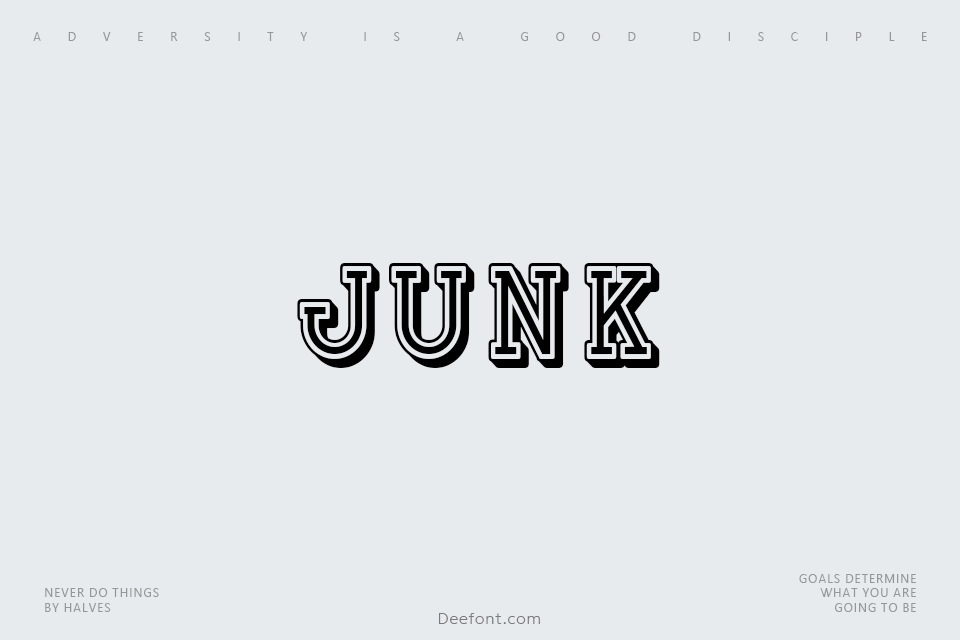 Junk Font is a creative display typeface that brings playful character and nostalgic flair to your projects. Designed for headlines, signage, and bold branding applications, this versatile font captures an energetic old school aesthetic. With its distinctive letterforms and decorative qualities, Junk Font excels at creating eye-catching visual impact. Whether used for poster design, retro-inspired graphics, or editorial layouts, this font delivers personality and charm. Perfect for designers seeking unique, attention-grabbing typography that stands out from conventional choices.
