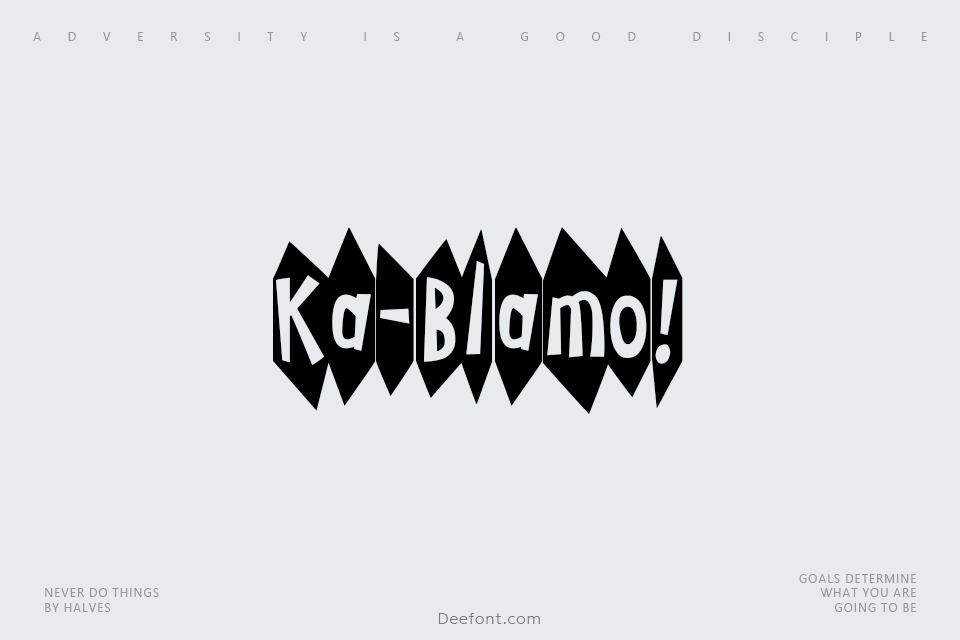 Ka-Blamo! is a playful display font designed by Anthony Robinson, featuring bold, cartoon-like letterforms with comic styling. This eye-catching typeface combines bouncy, rounded characters with decorative elements, making it perfect for headlines, posters, and creative projects requiring a fun, energetic visual impact.
