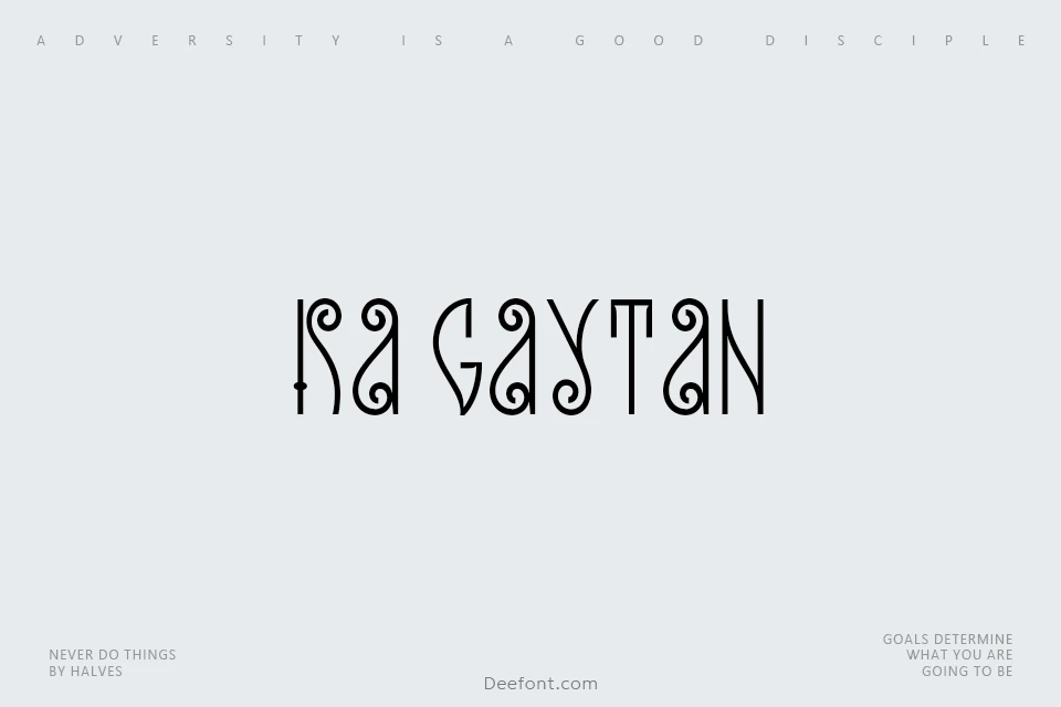 Ka Gaytan Font is a whimsical and decorative sans-serif typeface that stands out with its playful swirls and unique character details. Each letter is crafted with artistic flourishes, giving the font a lively and creative personality perfect for eye-catching headlines, posters, invitations, and branding projects. The combination of geometric structure and ornamental elements makes Ka Gaytan both modern and expressive, adding a sense of fun and sophistication to any design. Its distinct style ensures your message will be memorable and engaging, making it an excellent choice for projects that need a touch of originality and flair.