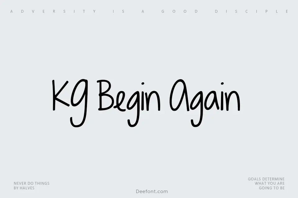KG Begin Again Font is a casual handwritten script with clean, rounded strokes, gentle curves, and a friendly rhythm that feels like neat notebook lettering. It shines on posters, quote graphics, classroom worksheets, social media images, and lighthearted branding where a relaxed, approachable personality is essential.
