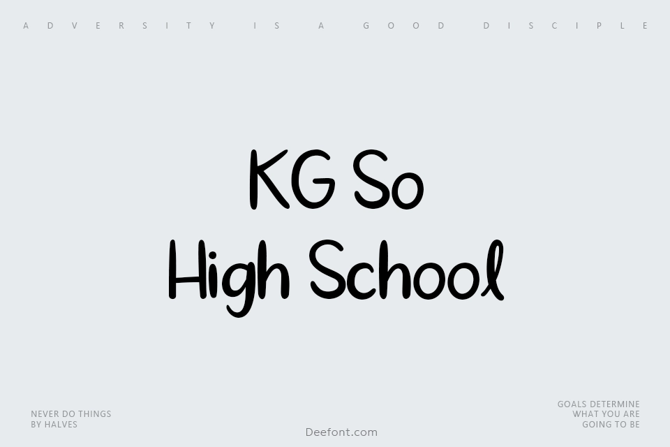 KG So High School is a playful and casual handwritten font designed by Kimberly Geswein, featuring soft rounded edges and informal letter design that captures whimsy and joy. With its friendly mood and relaxed feel, this versatile typeface is ideal for school projects, personal notes, scrapbooking, social media graphics, party invitations, and DIY projects requiring an approachable aesthetic. The font comes in two versions—standard and educator-friendly (EF)—with the EF variant featuring more standard letter formation suitable for primary grade students and readers.