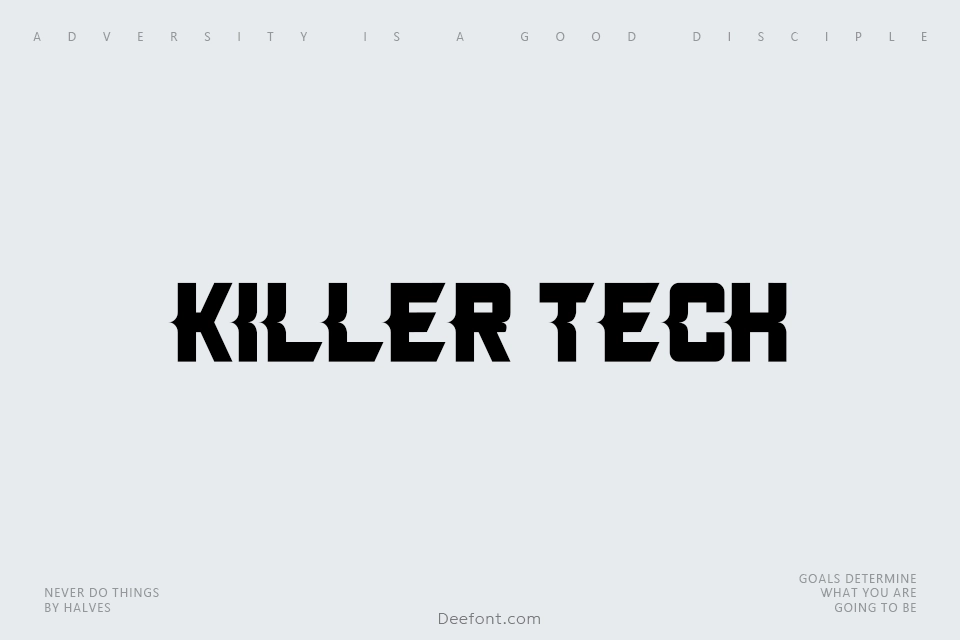 Killer Tech is a cool, bold, and dynamic display font that brings a futuristic edge to any design project. With its geometric shapes and uppercase letters, this typeface is ideal for web designs, business cards, headlines, signage, and creative branding. The font features a modern aesthetic with a strong presence, making it perfect for projects requiring unique visual impact and contemporary appeal.
