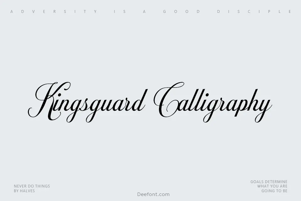 Kingsguard Calligraphy Font is an elegant script typeface characterized by graceful, flowing lines and intricate swashes that exude sophistication and grandeur. Designed by Måns Grebäck, it features ornamental loops and curves, making it ideal for luxury branding, high-end packaging, wedding invitations, and formal stationery. The font offers advanced OpenType functionality, including stylistic alternates, ligatures, and contextual swashes activated by underscores, allowing extensive customization. With support for all Latin-based languages and a comprehensive set of glyphs, it ensures versatility across diverse design projects. Its classic yet exclusive aesthetic bridges traditional calligraphy with modern typographic needs.