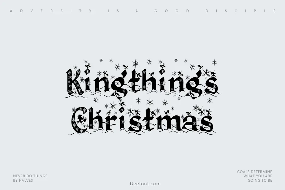Kingthings Christmas 2 is a distinctive display typeface designed with festive character. This gothic-style font features ornate letter forms adorned with snow and snowflake elements, evoking a medieval and vintage Christmas aesthetic. Perfect for holiday marketing, greeting cards, invitations, and seasonal campaigns, it delivers a charming and highly decorative appearance. With its expressive design and ornamental details, this font adds a touch of nostalgic elegance to any festive project. Best used at least one inch high to fully appreciate the intricate details and decorative elements integrated into each character.