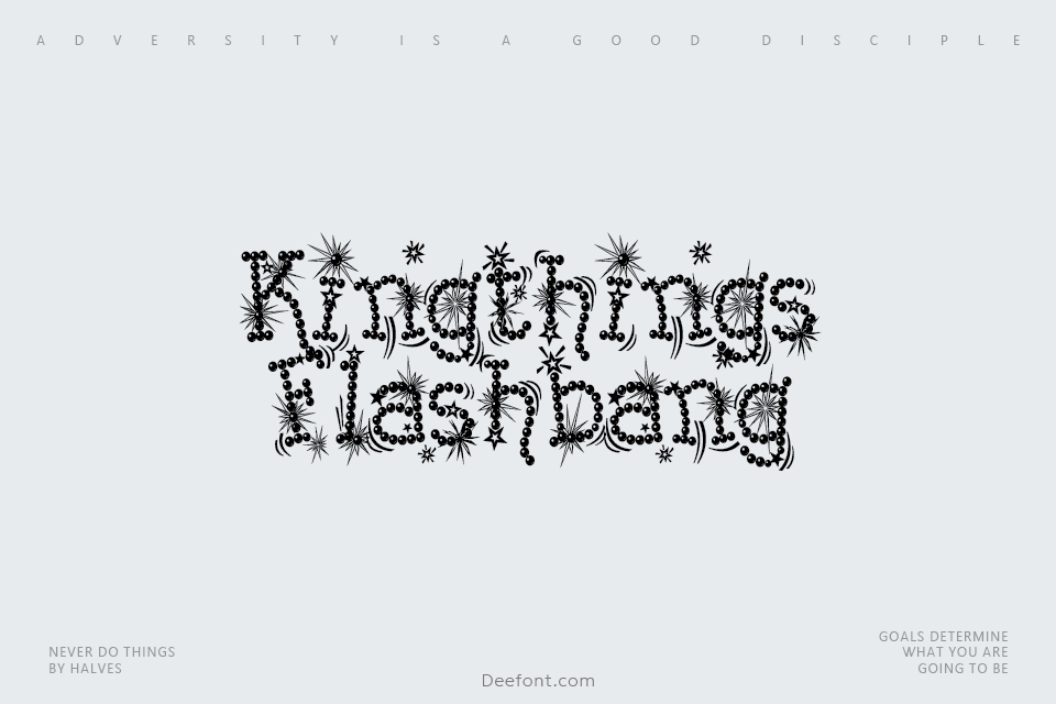 Kingthings Flashbang is a vibrant and playful decorative font that brings energy and creativity to your designs. This fancy typeface features unique, eye-catching characters perfect for adding personality to posters, invitations, and display projects. With its fireworks-inspired aesthetic and charming decorative elements, this font transforms ordinary text into extraordinary visual statements. Ideal for creative professionals seeking distinctive typography that captures attention and adds flair to any project.