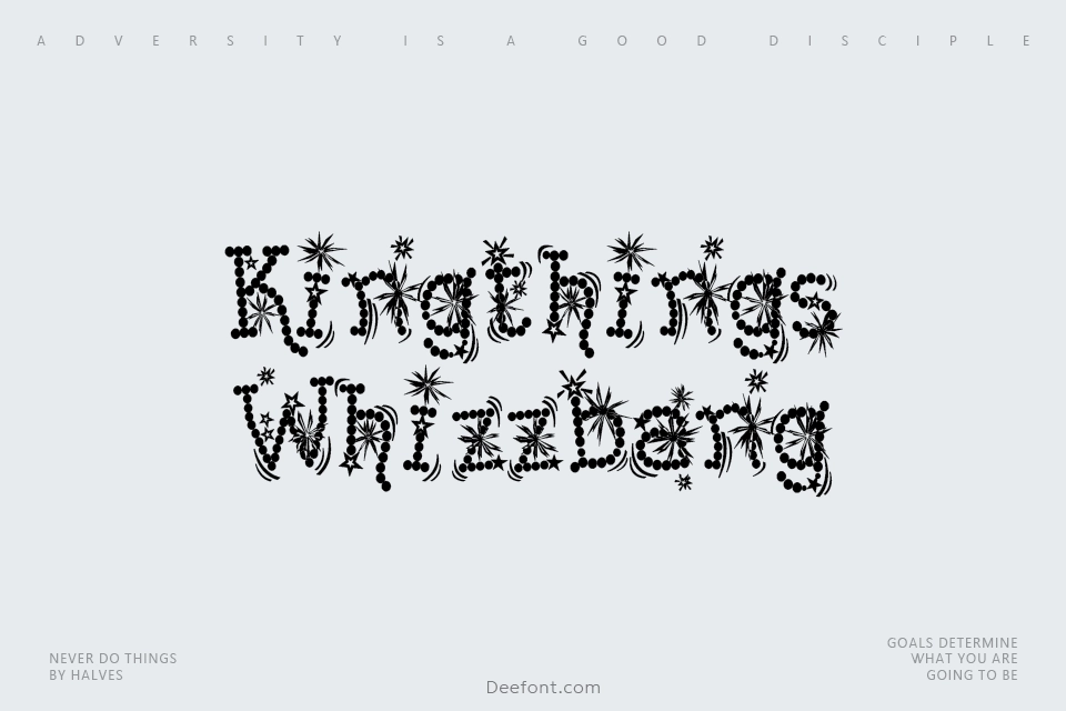 Kingthings Whizzbang is a highly decorative and whimsical display typeface featuring intricate ornamental patterns and playful elements within each character. The letters are adorned with stars, dots, and various decorative designs that create a festive and dynamic appearance. Each character is uniquely embellished with a mix of geometric shapes and organic forms that deliver a lively and energetic feel. This fancy font’s distinctiveness makes it ideal for creative projects requiring a touch of fun and personality, particularly suited for party invitations, festive event posters, children’s book covers, and creative branding endeavors.