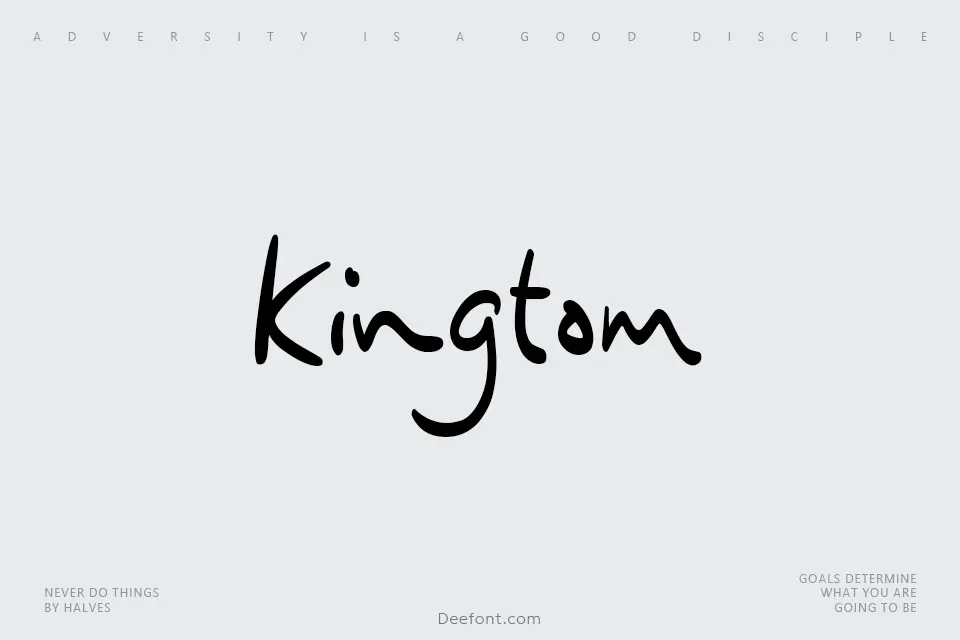 Kingtom is a charming and casual handwritten font designed to add a friendly touch to your creative projects. With its rounded, playful strokes, this typeface excels in headlines, quotes, and greeting cards where a warm, personal feel is needed. It supports multilingual characters, making it a versatile choice for modern branding and social media graphics.