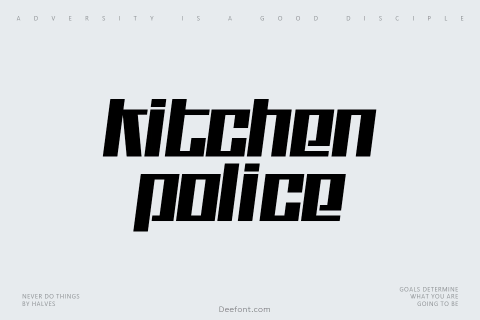 Kitchen Police is a distinctive techno and square display font designed by Jakob Fischer, known professionally as Pizzadude. This geometric typeface features bold, angular letterforms with a futuristic aesthetic, making it ideal for headlines, posters, and attention-grabbing designs. The font’s rigid structure and contemporary styling reflect its techno inspiration, offering designers a modern and striking typographic option for creative projects requiring strong visual impact.