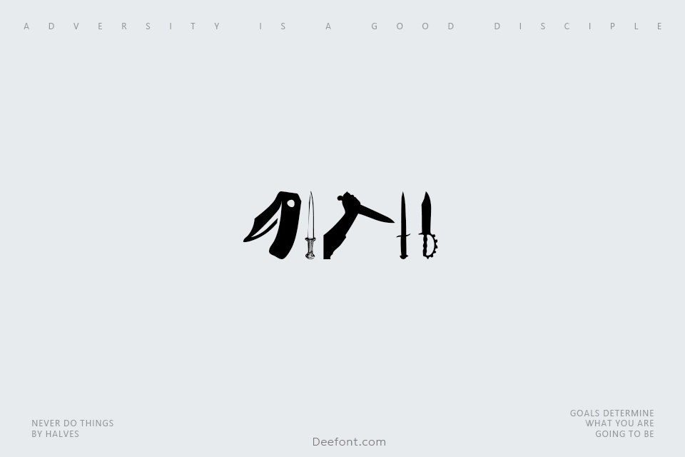 Knife is a striking decorative dingbats font composed entirely of knife and weapon silhouettes, transforming each character into a unique blade or hand holding a knife. With 236 glyphs of bold, highly stylized silhouettes, this display font prioritizes dramatic visual impact over traditional letterforms. Ideal for horror movie posters, Halloween event flyers, themed party invitations, and graphic novels, Knife delivers an edgy, unforgettable aesthetic perfect for projects requiring bold, thematic typography.