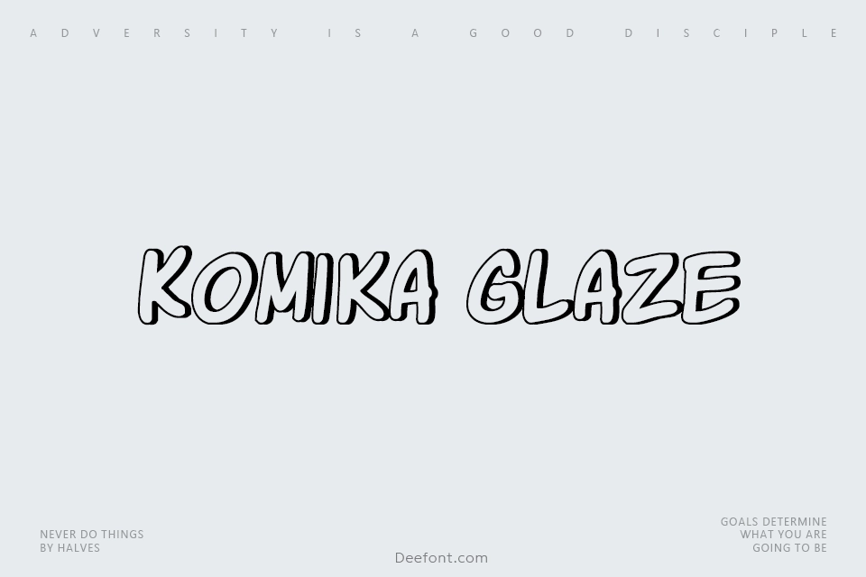 Komika Glaze is a playful and bold display font characterized by thick, rounded edges and outlined letters that evoke a comic-style, hand-drawn aesthetic. With its slightly irregular forms and dynamic energy, this cartoonish typeface features exaggerated curves and whimsical appeal. Perfect for children’s books, comic projects, posters, and playful branding, Komika Glaze brings fun and lightheartedness to any creative design requiring vibrant visual impact and engaging typography.