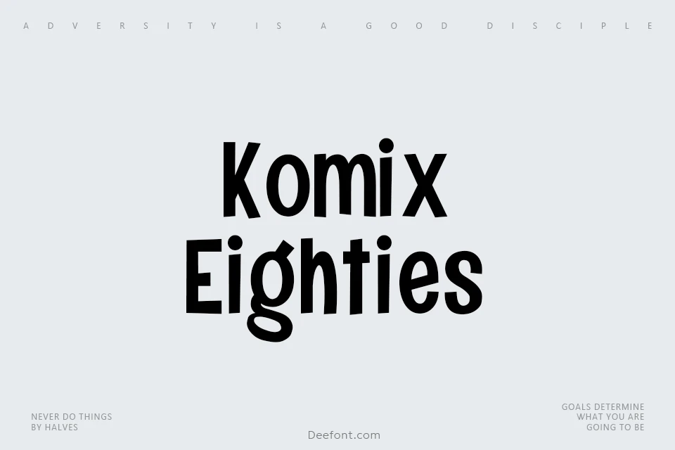 Komix Eighties Display Font is a fun and comical typeface designed to bring a vibrant and playful touch to your creative projects. With its comic-inspired style and fresh contemporary feel, this font is perfect for display, t-shirts, logo marks, typographic quotes, packaging, blog headlines, letterheads, and stationery. Its versatility makes it ideal for a wide range of crafty ideas, ensuring your designs stand out with a unique and lively character.