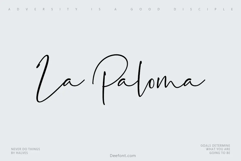 La Paloma is a gracefully connected handwritten script font crafted to convey elegance and refinement. With slender, feminine letterforms and smooth flowing strokes, this versatile typeface excels in logos, posters, handwriting mockups, magazine layouts, and business card designs. The font’s natural pen-like characteristics and decorative appeal make it an excellent choice for creative professionals seeking to add sophistication and personality to their visual compositions.