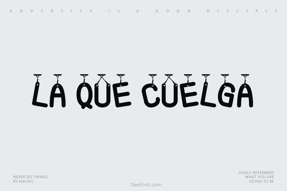 La Que Cuelga St Font is a playful and unique decorative font designed by Southype. The font features distinctive characters that appear to be hanging from hooks, creating a whimsical and eye-catching visual effect. With its bold, angular style and rounded characters, this font brings a creative and industrial feel to any design project. Available for free personal and non-profit use, La Que Cuelga St is versatile enough for various creative applications. The font’s distinctive hanging design makes it particularly suitable for projects that require a strong visual impact or a touch of playful creativity.