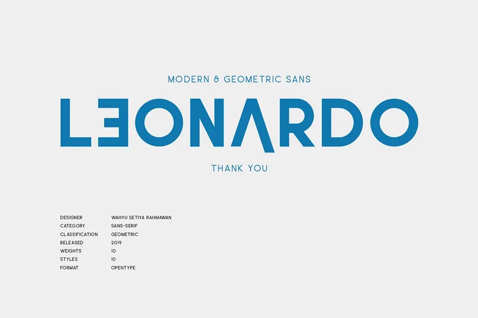 Leonardo Font is a modern sans serif typeface featuring a geometric touch and semi-rounded design elements. Created by Wahyu Rahmawan and Factory738, this versatile font family combines contemporary aesthetics with clean lines, making it ideal for graphic design, branding, web projects, and display use. Available in multiple weights including ultralight, regular, semi-rounded, and bold variants, Leonardo delivers excellent legibility and functionality across various applications from corporate identities to editorial layouts.