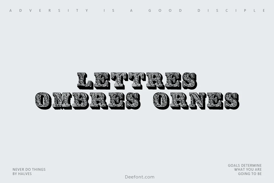 The Lettres ombrées ornées font is a decorative display typeface featuring ornate, shadowed capital letters with a charming retro aesthetic. Originally designed by the Paris-based foundry Schriftgiesserei J. Gillé in 1820 as a classic Empire-style ornamental typeface, this digital revival by Dieter Steffmann captures the elegance of historical decorative lettering. Perfect for vintage projects, fancy designs, and creative typography work.