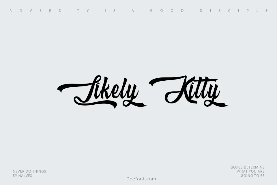 Likely Kitty Font is a delightful display typeface that combines playful charm with old-school character design. Featuring flowing, connected letterforms with decorative flair, this script font delivers engaging visual personality perfect for poster headlines, creative logos, and eye-catching titles. The rounded, animated stroke work creates an inviting, cheerful atmosphere ideal for designs targeting audiences who appreciate fun, decorative typography. Whether crafting vibrant brand identities, festive event materials, or playful digital content, Likely Kitty brings distinctive character and nostalgic warmth to display applications.
