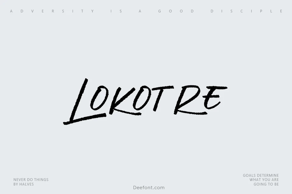 Lokotre Font is a dynamic handbrush textured display font designed by Glorytype. This energetic typeface boasts authentic brush strokes and a textured finish, giving it a raw, handcrafted appeal. Its bold, slightly slanted letterforms convey motion and personality, making it perfect for eye-catching headlines, logos, posters, branding, and apparel designs. Lokotre brings an organic, expressive touch to any project needing a burst of energy and a unique, handmade aesthetic. Use it to add character and make a strong visual statement with its distinctive, textured style.