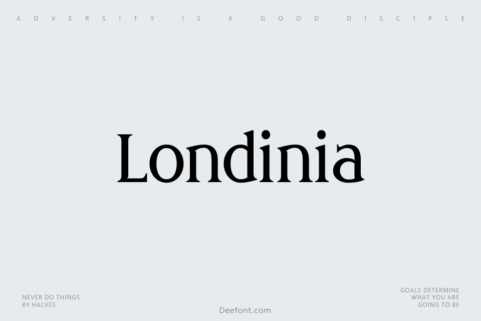 Londinia is a contemporary Roman typeface designed by Keith Bates, featuring clear, open shapes with a generous x-height and streamlined serifs. The font combines classical elegance with modern flair, perfect for formal and sophisticated typography applications. Small serif-shaped cutaways and subtle incisions provide refined details that enhance design impact while maintaining excellent readability across various mediums.