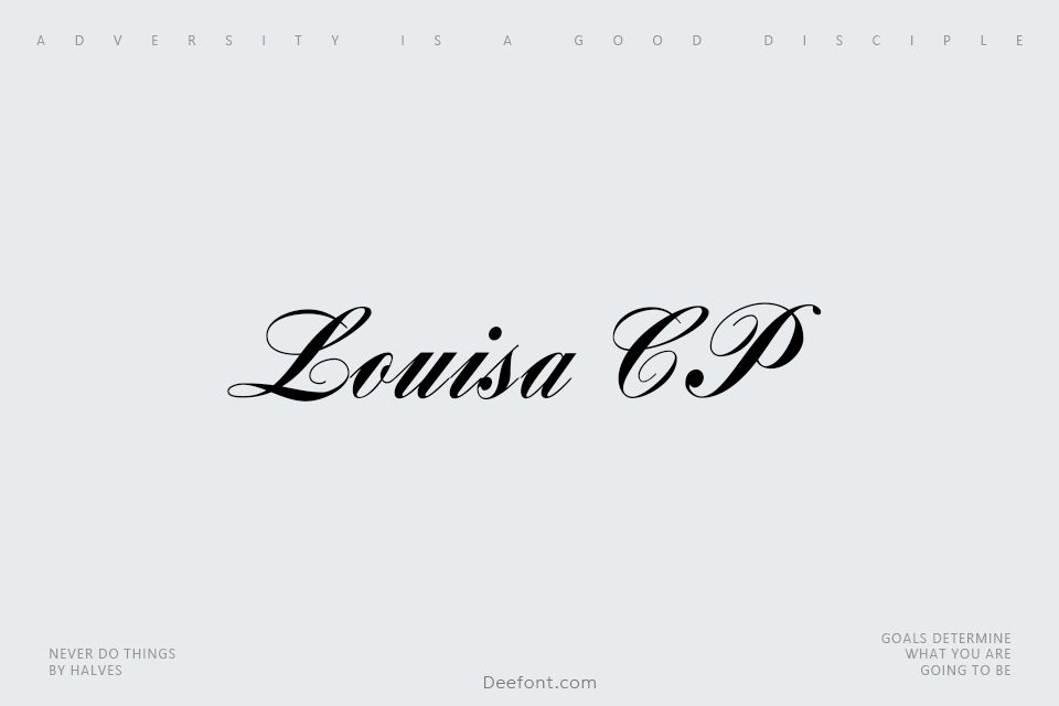 Louisa CP is an elegant and flowing script calligraphy font designed by Claude Pelletier. With its graceful curves and refined letterforms, this typeface evokes a vintage aesthetic reminiscent of 1970s design. The font features 150 glyphs and captures the charm of classical handwritten scripts, making it perfect for formal invitations, wedding designs, and sophisticated branding projects. Its smooth, decorative quality brings an artistic touch to any typography endeavor while maintaining excellent readability.