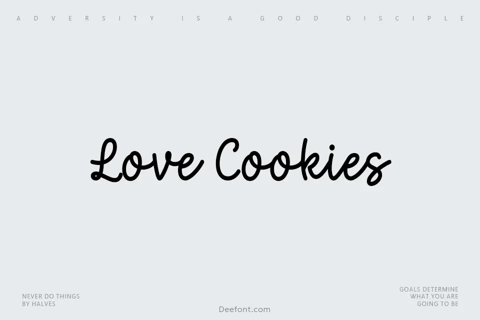 Love Cookies Font is a sweet, flowing handwritten script with chunky cookie-like strokes, rounded terminals and playful bounces. It is ideal for bakery logos, candy packaging, kids birthday invitations, festive posters, social media quotes and any design that needs a cute, cozy handmade feel.