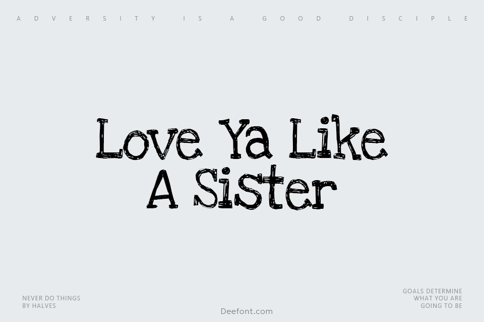 Love Ya Like A Sister is a playful, distressed sans serif font created by Kimberly Geswein with distinctive hand-drawn character and quirky charm. Featuring an expressive, rugged design with childlike letterforms, this versatile typeface combines awkward appeal with innovative creativity. Originally introduced in 2007, it has become widely beloved for personal and creative projects seeking a touch of fun and nostalgia. The font supports Latin scripts with both regular and solid variants available, making it perfect for infusing projects with whimsical personality