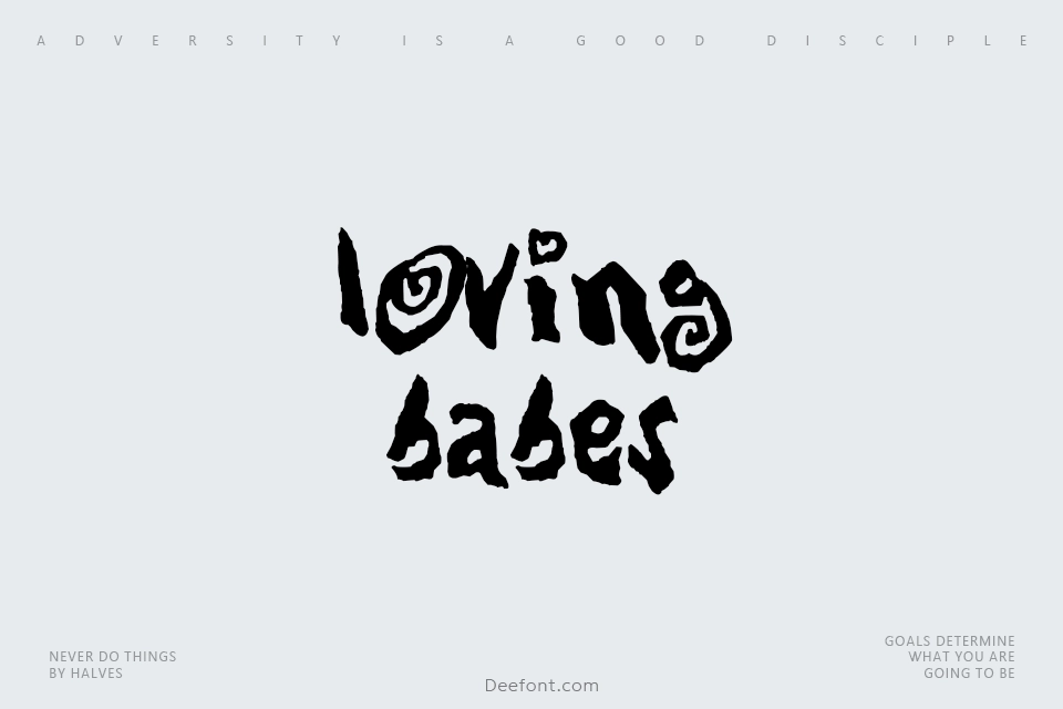 Loving Babes is a playful, bold decorative font featuring hand-drawn whimsical characters with quirky embellishments and unique, irregular shapes. The typeface combines energetic strokes with charming curly elements, spiral details, and distinctive decorative features that create a lively and artistic appearance. Perfect for children’s books, playful branding, party invitations, and creative posters, this font delivers a youthful, informal vibe while maintaining excellent readability through its bold weight and dynamic letterforms.