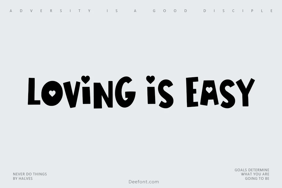 Loving Is Easy is a playful, bouncy display font inspired by romantic typography. This charming typeface features slightly irregular, chunky lettering with hand-drawn charm and subtle heart details, making it perfect for valentine’s themed projects, greeting cards, book covers, posters, packaging, and merchandise designs. With excellent readability and a friendly, approachable aesthetic, it brings warmth and whimsy to creative projects that need an effortlessly charming and unique character.