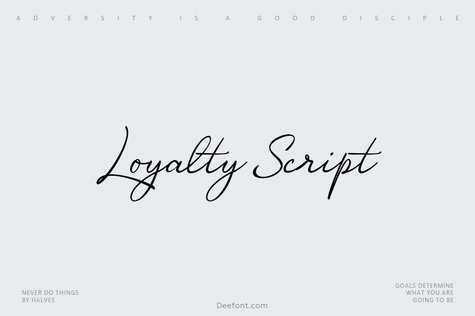 Loyalty Script is an elegant handwritten script font created by 50Fox Studio, featuring flowing cursive letterforms with high contrast between thick and thin strokes. Perfect for luxury branding, cosmetics design, and sophisticated typography projects. This modern calligraphic typeface combines warmth and elegance, offering a casual yet premium aesthetic suitable for creative endeavors.