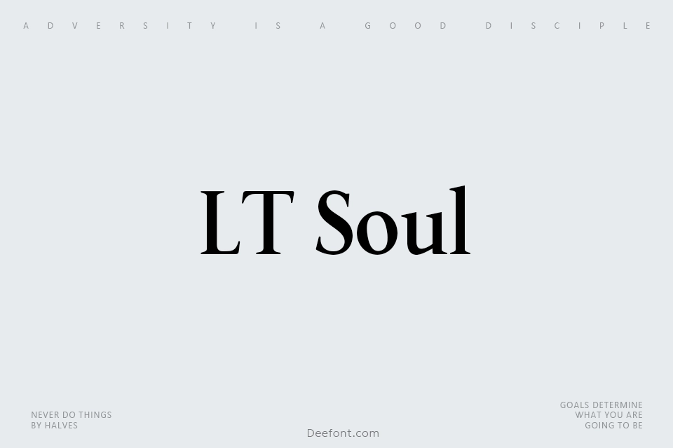 LT Soul is an elegant serif typeface designed by Daniel Lyons through LyonsType, featuring a sophisticated balance of classical tradition and contemporary aesthetics. With its four carefully crafted weights—Regular, Medium, Semi-Bold, and Bold—this versatile font excels in both print and digital applications. The typeface showcases refined serifs, harmonious proportions, and smooth curves that bring elegance and readability to headlines, branding materials, luxury packaging, and editorial design. Perfect for designers seeking a timeless yet modern serif font that combines grace with boldness and versatility across diverse creative projects.