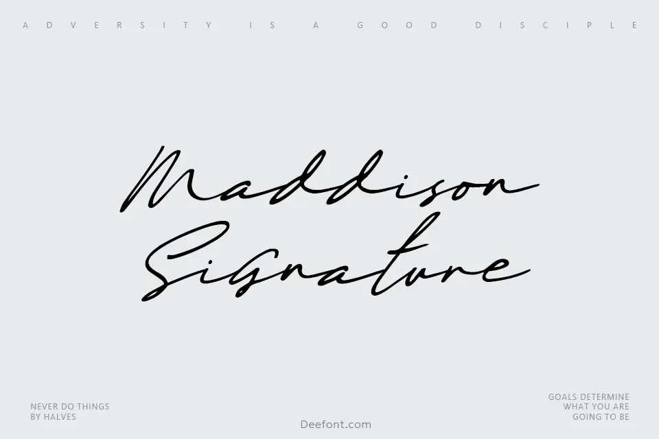 Maddison Signature is a gorgeous handmade signature font featuring over 170 ligatures for an authentic, organic appearance. This elegant cursive typeface displays flowing, sweeping strokes characteristic of refined handwriting. Ideal for creative projects including poster design, book covers, merchandise, branding campaigns, newsletters, wedding stationery, greeting cards, and signature-style display work. The graceful letterforms create a sophisticated, personal touch perfect for modern design endeavors requiring handwritten elegance.