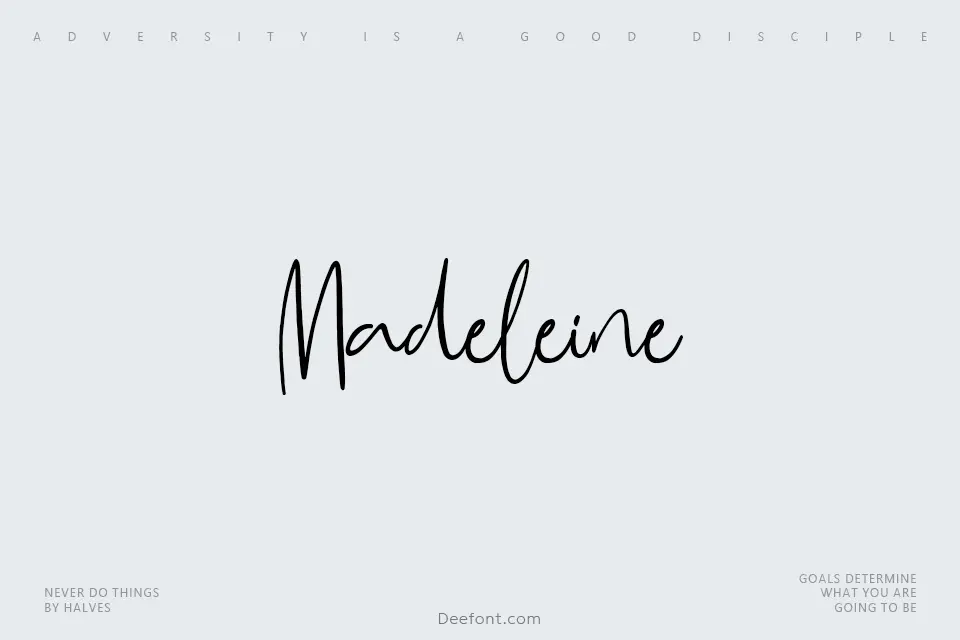 Madeleine is an elegant handwritten signature font featuring meticulous letterform craftsmanship with 29 alternate characters and 95 dynamic ligatures. Each letter is carefully designed to vary in height, creating authentic handwriting authenticity through natural inconsistency. The flowing cursive letterforms make it ideal for wedding invitations, personal branding, greeting cards, logo design, and decorative lettering projects that demand a sophisticated, handcrafted aesthetic.