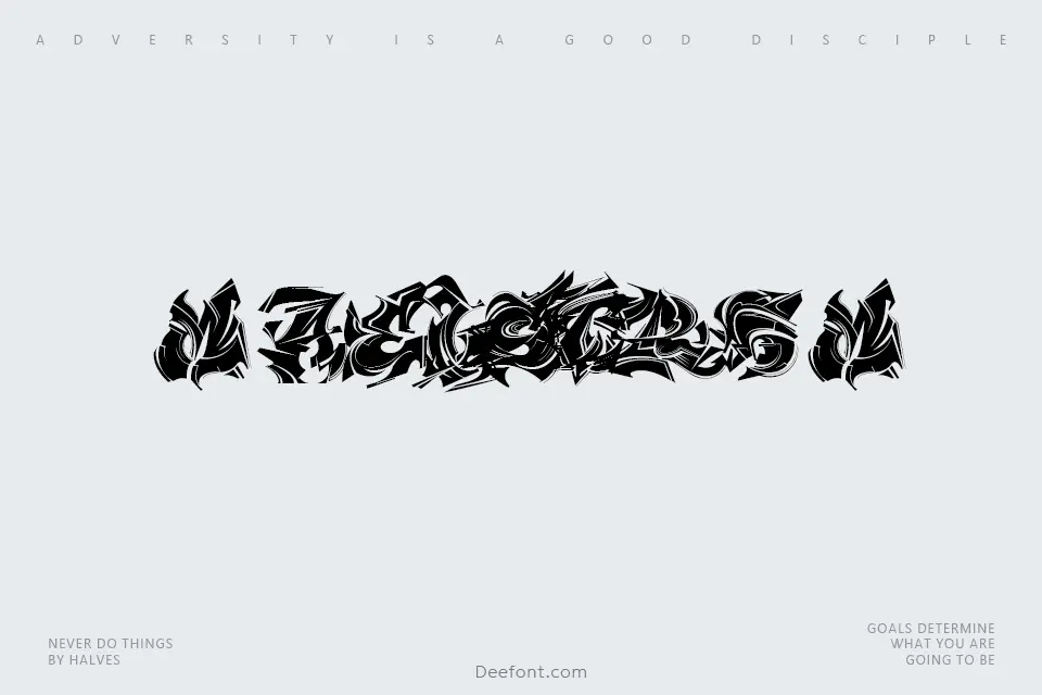 Maelstrom is a bold and intricate graffiti-inspired display font featuring uniquely stylized characters with sharp angles and flowing curves. Each letter showcases artistic expression with densely packed elements, creating a dynamic and energetic appearance. The chaotic yet controlled design combines strong emphasis on creative expression with unconventional visual impact, making it an ideal choice for street art projects, album covers, urban-themed posters, and edgy branding materials that demand a striking statement.