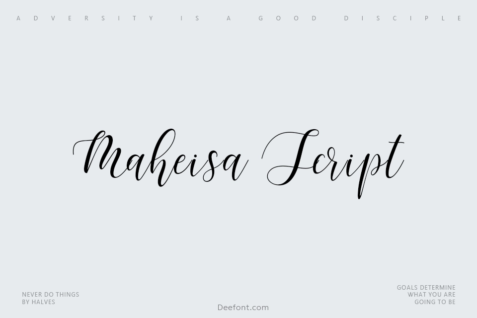 Maheisa Script is a modern calligraphy typeface featuring romantic and contemporary script styling with carefully crafted letterforms. Perfect for invitations, greeting cards, posters, branding, logos, fashion projects, and stationery designs that require elegant and sophisticated typography. This versatile script font delivers a fresh and fabulous visual appeal while maintaining readability across various creative applications.