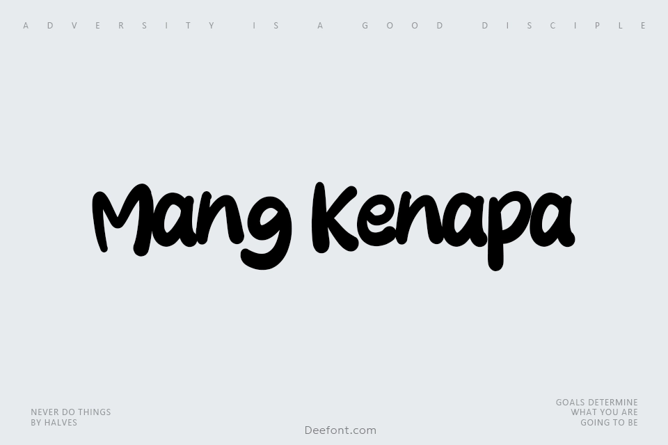 Mang Kenapa is a vibrant display font with cartoon and fancy characteristics, designed for creative projects seeking expressive typography. This playful typeface combines decorative elements with a whimsical style, making it perfect for posters, headings, and imaginative designs that demand visual impact and personality.