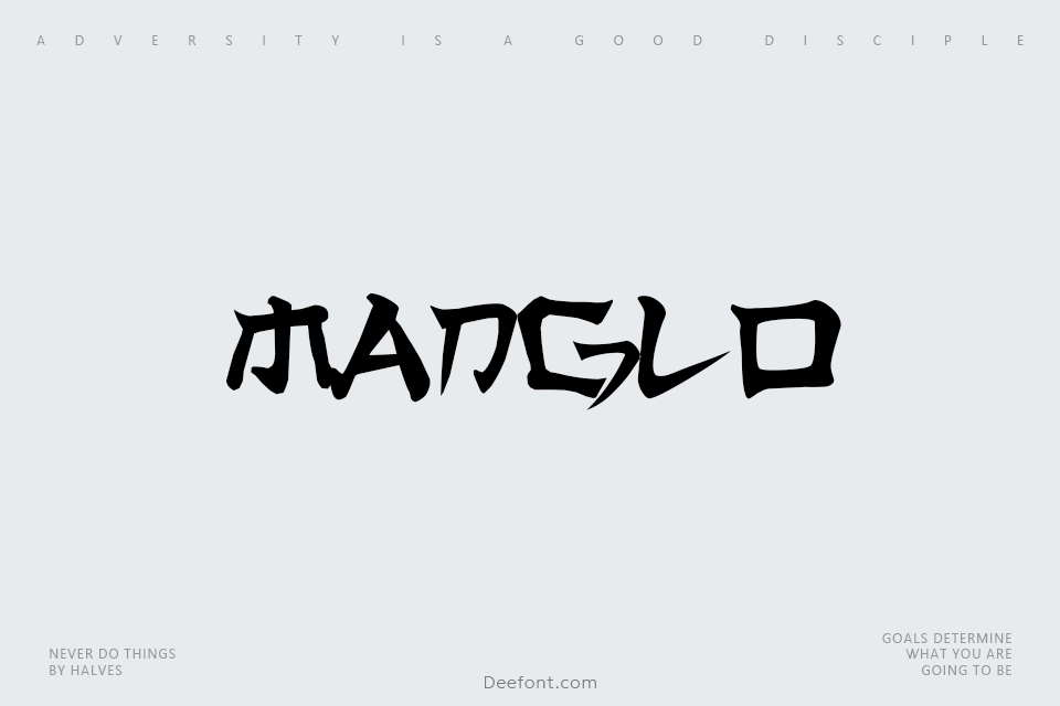 Manglo is a distinctive display typeface modified from Japanese Katakana, designed to deliver an authentic oriental aesthetic for creative projects. Originally created in 2000, this freeware font features 28 glyphs and offers a unique foreign look ideal for titles, headers, and decorative design work. With over 112,000 downloads on DaFont, Manglo provides designers with a cost-effective solution for adding Asian-inspired visual elements to their typography, whether for print or digital applications.