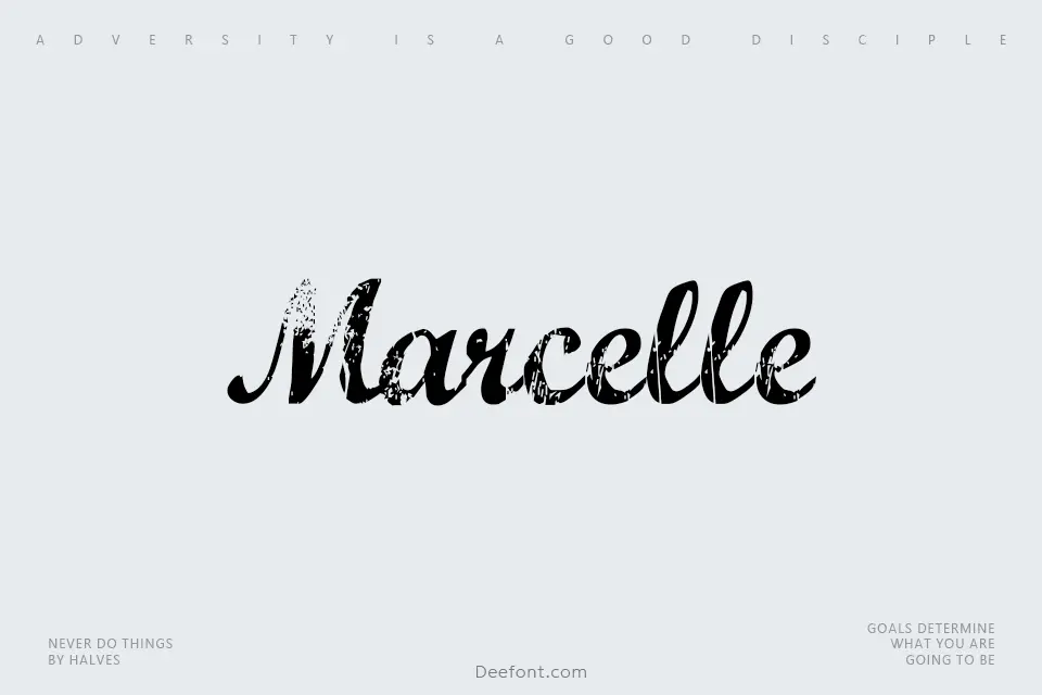 Marcelle Font is a distressed old-school script with bold, slanted letterforms, heavy ink texture and rugged swashes that recall vintage baseball jerseys. Its rough edges and dramatic curves create energetic, high-impact titles, ideal for sports logos, apparel graphics, posters, packaging, album covers and any project needing a weathered retro display script.