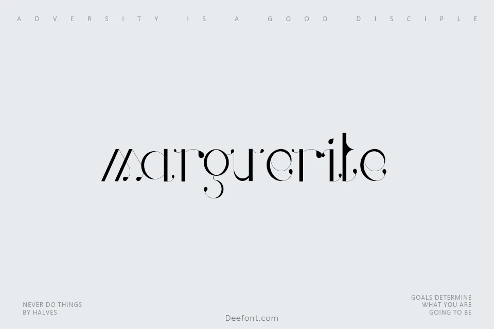 Marguerite Typeface is a unique and artistic typeface characterized by its minimalist, geometric forms and distinctively modern aesthetic. Designed with a focus on creative expression, Marguerite Typeface stands out with its unconventional letterforms and stylish use of negative space. This font is ideal for branding, editorial design, posters, and any project seeking a sophisticated, avant-garde look.