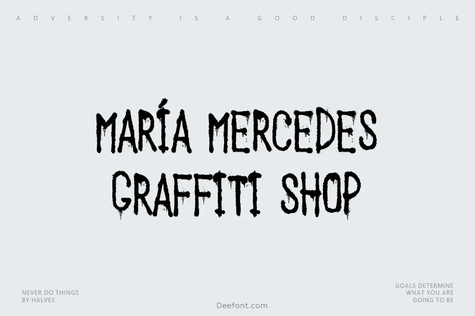 María Mercedes Graffiti Shop is a vibrant graffiti typeface created by Barcelona-based designer Woodcutter that captures the dynamic energy of urban street art. With its bold, flowing letterforms and artistic flair, this script font brings creativity and visual impact to posters, flyers, and contemporary design projects. The typeface features 236 glyphs with partial accent support and euro symbols, making it suitable for multilingual applications. Perfect for designers seeking a striking display font that combines playful graffiti aesthetics with professional typographic quality.