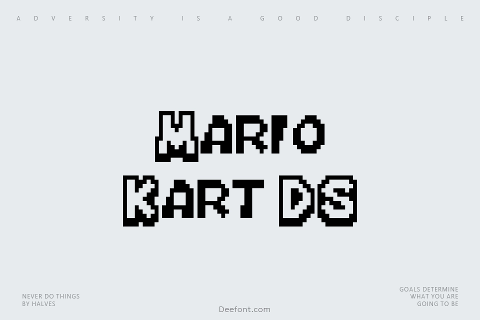 Mario Kart DS is a bold, pixelated bitmap font inspired by classic video game graphics from the Nintendo DS racing title. This decorative typeface features blocky, geometric letterforms with a consistent height across uppercase and lowercase characters, delivering a retro digital aesthetic perfect for gaming-related designs, nostalgic branding, and playful creative projects. With its distinctive pixel-perfect style and vintage charm, the font captures the essence of early 2000s gaming typography while remaining highly versatile for contemporary design applications seeking a touch of nostalgic flair.