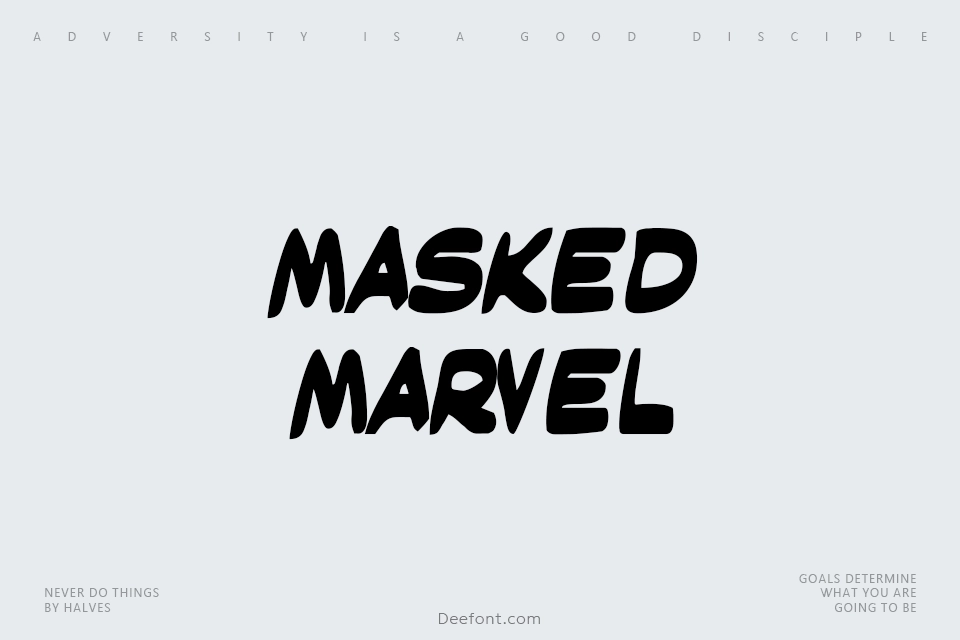 Masked Marvel is a bold and dynamic display font featuring rounded, slanted characters with a playful and energetic feel. Created in 2002, this decorative typeface delivers a strong visual impact with thick, consistent strokes ideal for comic books, posters, and creative branding projects. The font maintains uniform appearance across uppercase and lowercase letters while retaining a unique flair through cohesive design of numbers and special characters. Perfect for projects requiring a bold statement or creative touch.