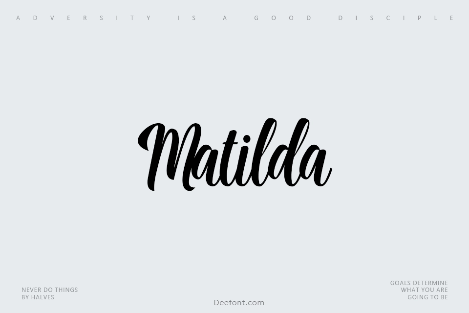 Matilda is a modern script typeface designed with meticulous detailing and original hand pulls. This contemporary calligraphy font features an elegant, stylish aesthetic perfect for photography, signatures, branding, and logos. Combining classic charm with modern sensibility, Matilda offers a sophisticated blend of simplicity and strength, making it ideal for wedding invitations, creative projects, and professional design work that demands distinctive character and refined elegance.