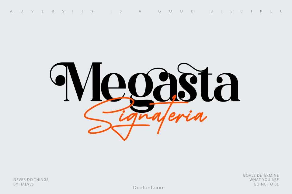 Megasta Signateria is a versatile font duo from Storytype Studio, featuring two complementary styles: Megasta, a modern serif font, and Signateria, a monoline signature script. Megasta presents a bold and elegant look with unique character shapes and stylish flourishes, offering a sophisticated feel. Signateria provides a contrasting fluid, handwritten style with smooth, consistent strokes, adding a personal and chic touch. This pairing creates a dynamic visual balance, blending structured elegance with flowing script. It’s well-suited for branding, logos, invitations, headlines, and other design projects seeking a blend of modern impact and personal flair.