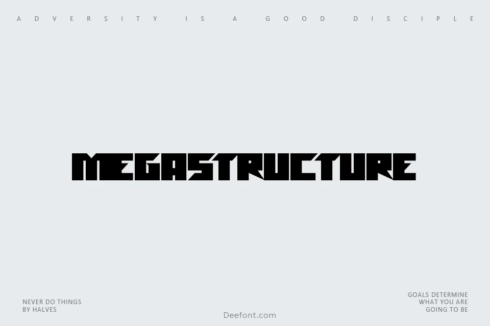 Megastructure is a bold, geometric display font with sharp angles and a futuristic aesthetic, designed by Darrell Flood. Featuring thick, block-like characters with unique cuts and edges, it delivers a dynamic, industrial sci-fi style perfect for headlines, logos, and posters. Supporting over 207 languages, this striking typeface conveys strength and modernity, ideal for projects requiring strong visual impact.