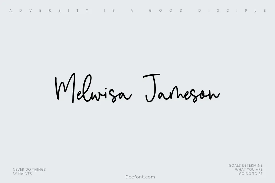Melwisa Jameson is a modern monoline calligraphy script font featuring elegant, flowing letterforms with smooth, connected strokes. This handwritten typeface delivers sophisticated cursive aesthetics ideal for wedding invitations, branding projects, product packaging, social media graphics, and decorative titles. With consistent monoline construction and refined curves, the font brings a contemporary yet graceful touch to any design requiring personalized, handwritten elegance and polished manuscript beauty.