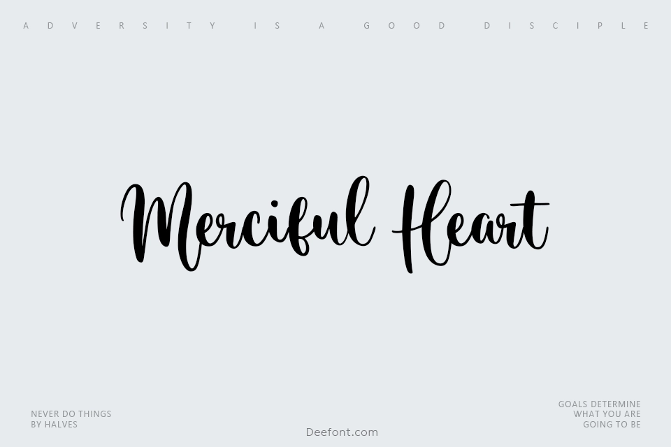 Merciful Heart is an elegant and graceful calligraphy script font created by Sronstudio, designed with beautiful alternate swashes and decorative elements perfect for craft projects. The font features lovely letterforms that provide a sense of lightness and romance, making it ideal for creating invitations, greeting cards, logos, and Valentine’s designs. With its sophisticated strokes and refined aesthetics, this typeface adds a touch of elegance to any creative project.
