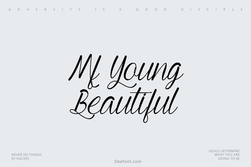 Mf Young & Beautiful is an elegant calligraphy and script font designed with flowing, handwritten characteristics perfect for wedding invitations, quotes, and artistic typography projects. This beautifully crafted typeface features decorative script elements ideal for designers and crafters seeking to add sophistication and elegance to their creative work.
